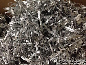 越都大型碎紙機(jī)事業(yè)部為全球最大的抗腫瘤藥物研發(fā)企業(yè)――羅氏制藥,提供銷毀中心建設(shè)解決方案,圖2為藥品鋁箔包裝粉碎效果。