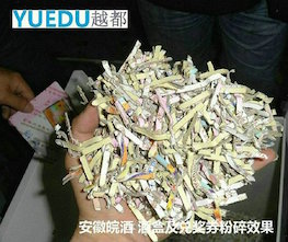 青島大型碎紙機(jī)粉碎獎(jiǎng)卡案例 青島壹枝筆啤酒有限公司采購(gòu)越都碎紙機(jī)粉碎獎(jiǎng)券 獎(jiǎng)卡